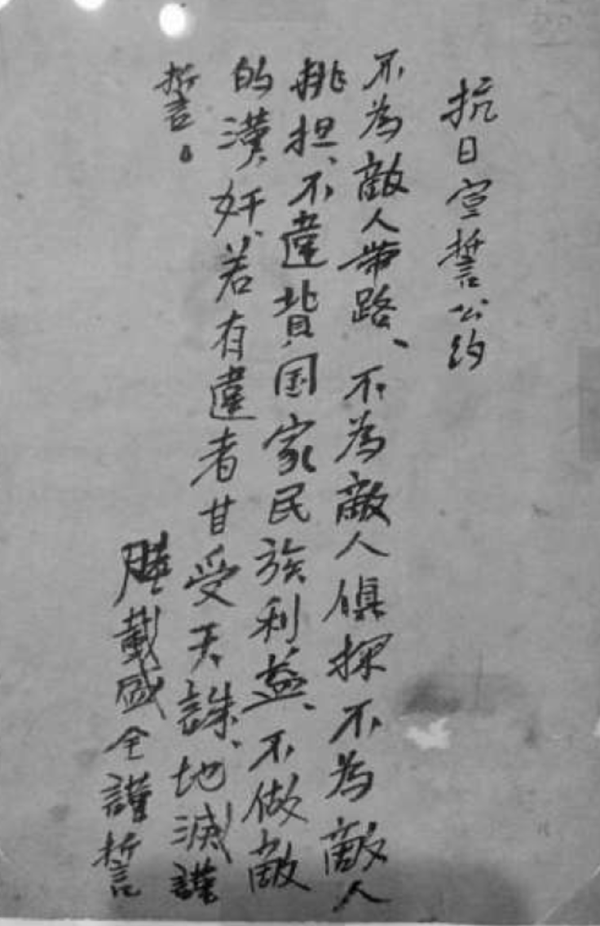 “不为敌人带路,不为敌人侦探,不为敌人挑担,不违背国家民族利益,不做敌的汉奸,若有违者甘受天诛地灭。谨誓。”